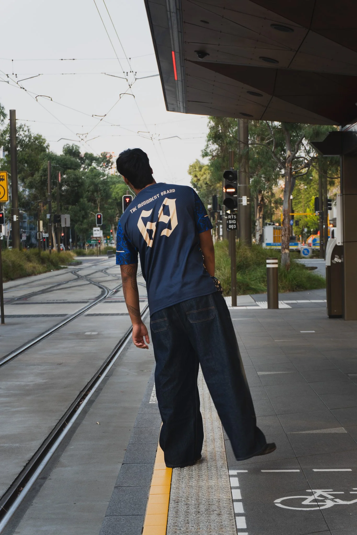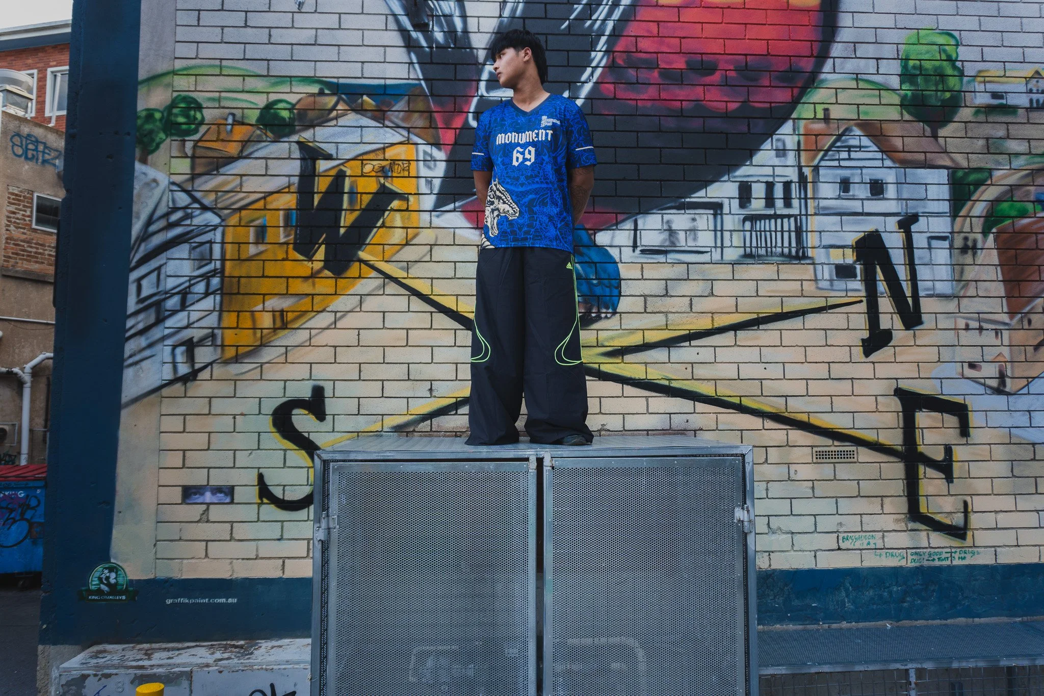 a person wearing dark blue gym tshirt with letters 69 printed on top and a dark grey parachute track pants